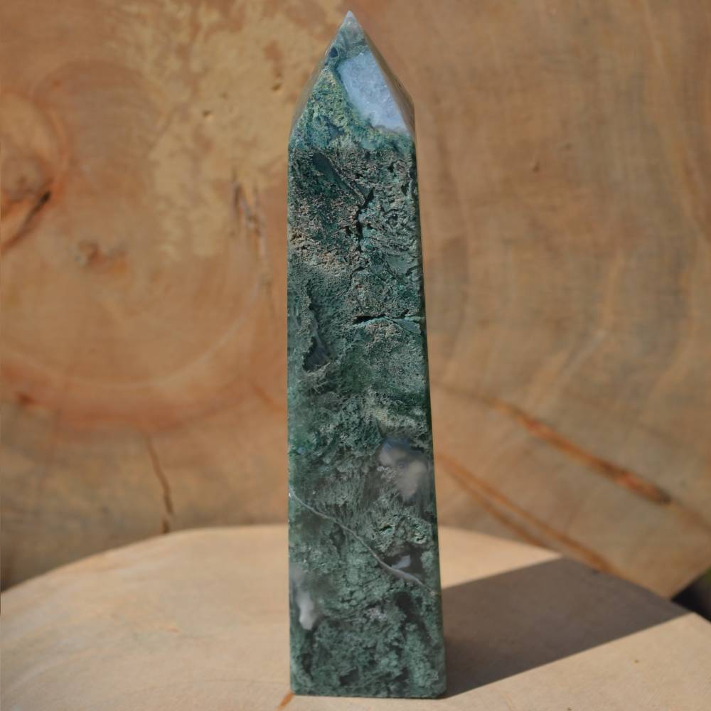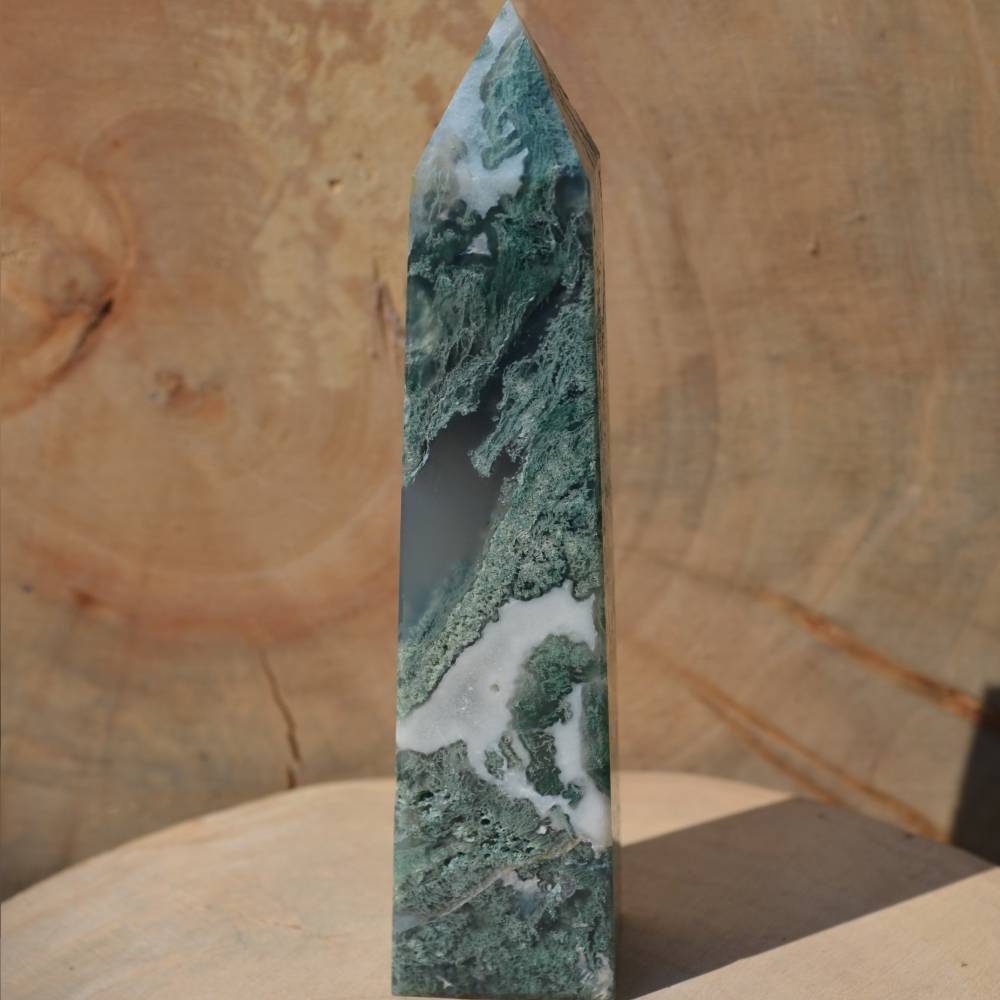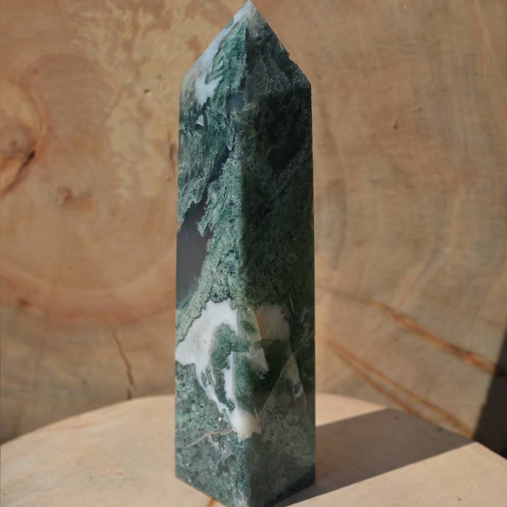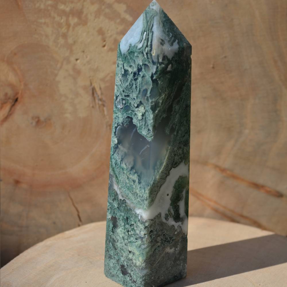 L’Agate mousse représente la pierre du bonheur, de la richesse et de l’amitié. Sa couleur verte a la structure complexe et ses dessins évoquent une mousse qui se serait développée dans la pierre. L’Agate mousse augmente la forme physique, ses vertus revitalisantes font d’elle la pierre idéale des femmes enceintes. De par sa composition elle aide à éviter les carences ferriques et permet un sommeil paisible. C’est la pierre des professions liées au monde végétal, comme les agriculteurs, les jardiniers, les paysagistes… L’Agate mousse favorise la confiance en soi et le courage. Pierre de communication aide à prendre des initiatives, nous libère de nos peurs et détourne les énergies négatives. C’est au chakra du cœur que cette variété offre la pleine mesure de ses propriétés. Elle est un lien délicat et foisonnant avec la Terre-Mère dont elle véhicule l’amour. C’est une pierre idéale pour les personnes souffrant d’état dépressif.